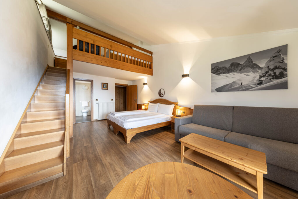 La camera familiare con soppalco dispone di un’area living con un letto matrimoniale, e di un soppalco in legno con due letti singoli. Il pavimento è senza moquette. Questa è la soluzione migliore per le vacanze in montagna di una famiglia o un gruppo di amici.