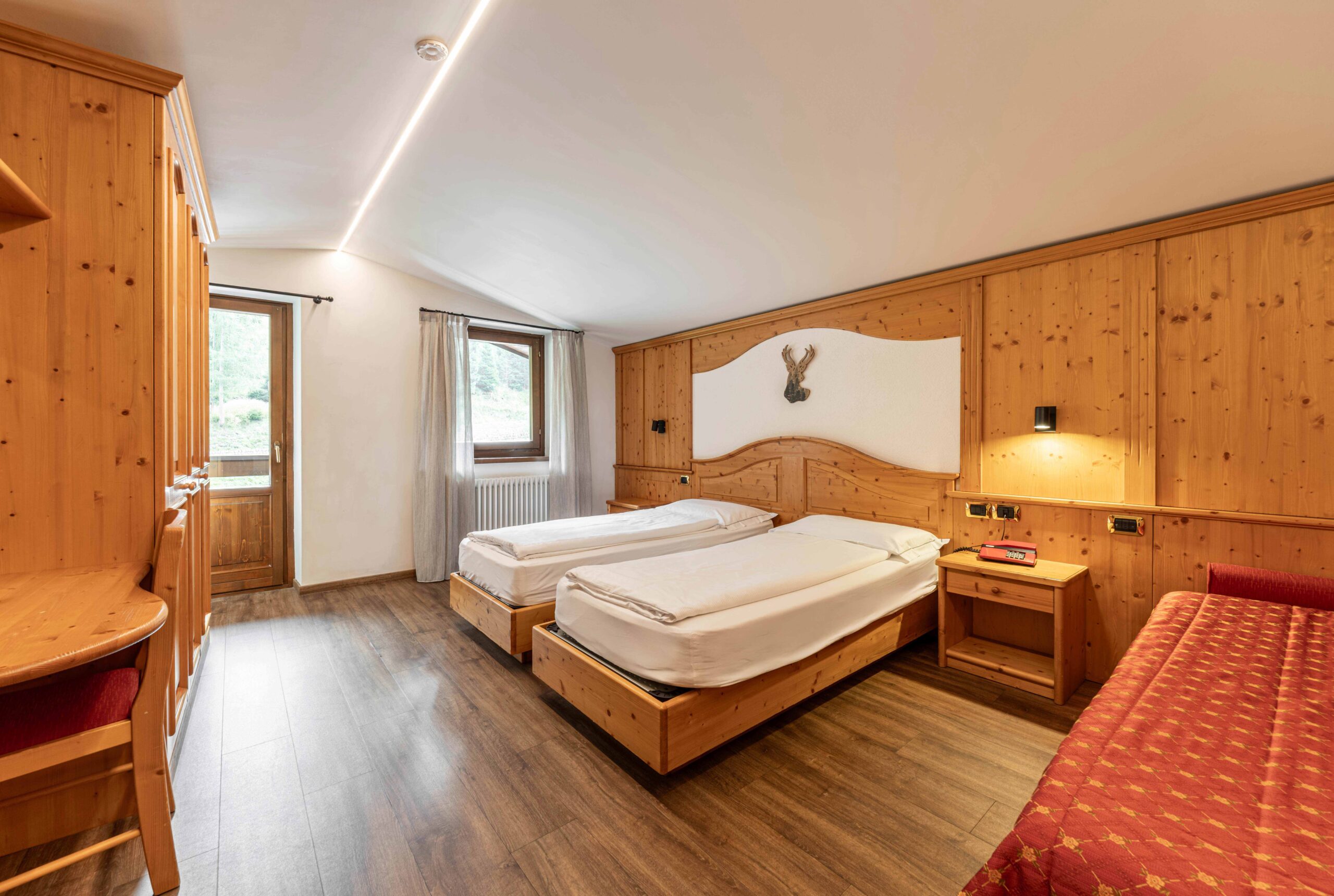 La camera tripla ha un letto matrimoniale e un letto singolo. Il pavimento senza moquette e il design dallo stile alpino, con legno a vista, creano un’atmosfera rilassante e confortevole.